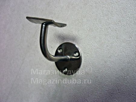 Кронштейн сварной из нержавейки. Используется для крепления деревянного или металлического поручня к стене. Может использоваться как внутри, так и вне помещений. Крепится к стене с помощью трех саморезов (в комплект не входят). Предназначен для крепления круглого или профильного поручня (деревянного или металлического) к стене. Расстояние от стены до середины поручня - 70 мм. Достаточно сложен в установке, требуется точно определить угол наклона площадки под поручень. также в случае установки деревянного поручня из дуба или бука недостаточно изящен. Имеет смысл присмотреться к кронштейну для перил с покрытием.