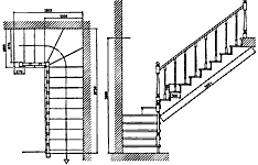 - лестница двух маршевая Г– образная с поворотом на 90 градусов через забежные ступени. На косоурах, с подступенками, ограждение деревянное по одной стороне, с балясинами.