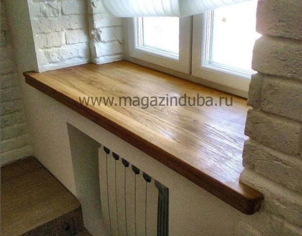 На фото подоконник из массива цельноламельного дуба, цвет натуральный, покрытие - прозрачный полуматовый лак.
