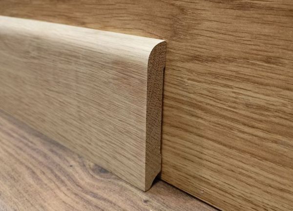 Прямой классический плинтус из массива дуба марки Экстра. Изделие премиального качества, не требует грубой обработки перед окрашиванием или покрытием лаком.